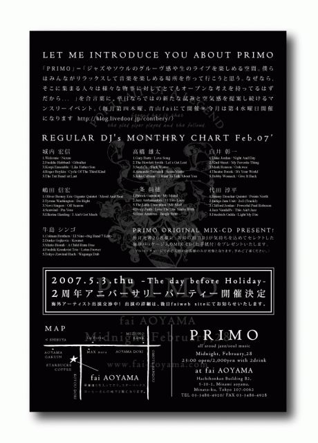 「PRIMO」=「ジャズやソウルのグルーヴ感や生のライブを楽しめる空間。僕らはみんながリラックスして音楽を楽しめる場所を作って行こうと思う。なぜなら,そこに集まる人々は様々な物事に対してとてもオープンな考えを持ってるはずだから... 」を合言葉に、平日ならではの新たな試みと空気感を提案し続けるマンスリーイベント。(毎月第四木曜、青山faiにて開催*今月は第4水曜日開催になります)