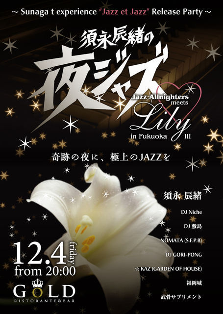 須永辰緒の夜ジャズ』 -Jazz Allnighters meets Lily in Fukuoka Vol.3- -Sunaga t experience "Jazz et Jazz"Release Party-@GOLD 日時:12/4(Fri) 20:00 - until late at night 前売り\2500 / 当日\3500 (+1drink order) DJ’s: 須永辰緒 DJ Niche DJ敷島 NOMATA(S.F.P.B) DJ GORI-PONG ☆KAZ(GARDEN OF HOUSE) LIVE: 福岡城 武骨サプリメント チケットぴあ:0570-02-9999【Pコード:340-079】 ローソンチケット:0570-084-008【Lコード:86246】 Ticket info:guys Music Entertainment 092-733-1199 GOLD 092-402-5512
