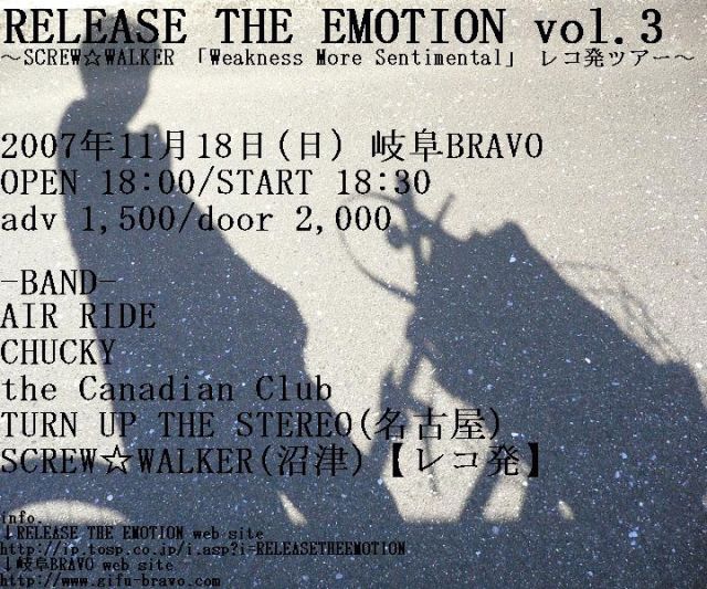 11月18日(日) 岐阜BRAVO 『RELEASE THE EMOTION vol.3 〜SCREW☆WALKER 2nd full album「Weakness More Sentimental」レコ発ツアー〜』 OPEN 18:00/START 18:30 adv 1,500/door 2,000