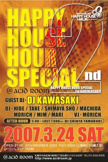 告知失礼します。 H.H.Hの2周年です。 早い物であっという間に2年が経とうとしています。 本当に有難うございます。(__) で今回はGUESTを呼んじゃいました。 DJ KAWASAKIさんです。 皆さんお祝いに来ちゃって下さい。 ■詳細■ 3/24(土) HAPPY HOUSE HOUR 2nd Anniversary Special OPEN 21:00 ADV/MEMBER 2000 ローソンLコード19588 DAY2500(共に1Dオーダー制) GUEST DJ>> DJ KAWASAKI DJ>> HIDE/TAKE/SHINYA YAMABUKI/SHIMAYA SHO/MACHIDA/MIM/MORICH VJ>> MORICH
