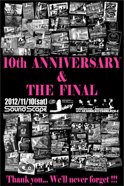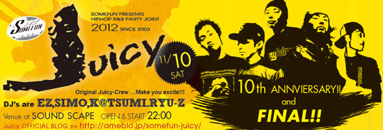 Original Juicy Crew … Make You Excite!!! アッパーなフロアバンガーやスウィートなメロウナンバーをはじめとする 最新のメインストリームサウンドと共に、いわゆる『Classics』と呼ばれる 後世にずっと伝えていきたいGOOD MUSICまでのワイドレンジな選曲を一晩に凝縮!! CLUB MUSICの楽しさとアツいVIBESをお届する、まさに来たヒト全員が主役の 全員参加型の026City屈指の老舗HIPHOP,R&B EVENT!!! おおかげさまで昨年2011/11/12で9周年を迎え、 今年から前人未踏の10年目に突入です!!!