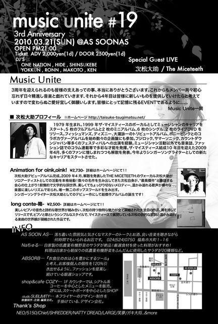 3周年を迎えられるのも皆様の支えあっての事、本当にありがとうございます。これからもメンバー共々初心忘れず日々精進し音楽と戯れていきます、それから4年目は皆様に新しいものを提供していけたらと考えていますので変わらぬご愛好宜しく御願いします。皆様にとって記憶に残るEVENTであるように....... Music Unite一同