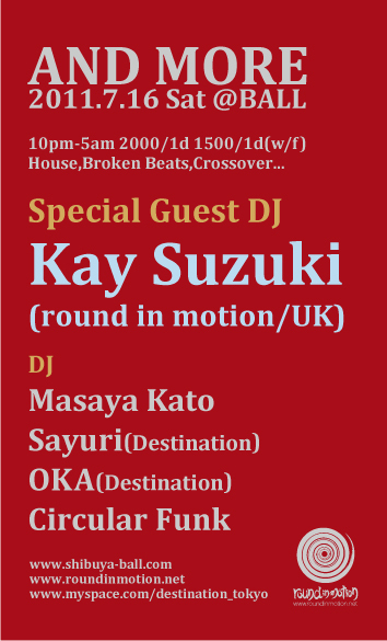 Kay Suzuki(ケイスズキ) http://www.roundinmotion.net ロンドンを拠点に活動する日本人音楽家。2007年1月にBBC受賞パーティ/レーベル"CO-OP"からデビュー・リリース。その後もオリジナル、リミックス、リエディット等、精力的に作品を発表し続け、2010年にリリースされたファースト・アルバム"CONSCIOUSNESS"では西アフリカの伝統音楽家から現在のロンドン・クラブシーンを賑わすシンガー/ミュージシャン達をフィーチャーし、ヨーロッパやアメリカ以外にも南アフリカでファーストEPが大ヒット。世界中の著名DJやプロデューサー達からも熱い支持を受ける。DJとしても地元ロンドンのラジオやクラブ以外に数々のヨーロッパ諸国やアジアにも招かれ、日本ツアーも年々その規模を拡大中。2011年は他アーティストの作品を含め、自身が運営するレーベル"round in motion"と"bipolar"からリリースを多数予定。幼少期から恵まれた音楽環境で育ち、ソウル、ジャズ、ファンク、アフロ・ビート等の生音楽から、デトロイトテクノ、ハウス、ロンドンのベースミュージックまで、その時代や都市のメッセージ・精神性が反映された文化的なダンスミュージック全般に多大な影響を受け、独自の哲学から基づく『時間芸術』を追求中。