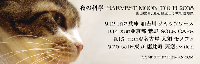 GOMES THE HITMAN.COM presents “夜の科学 in Nagoya〜長月のノクターン” 出演;山田稔明(GOMES THE HITMAN) 場所:名古屋大須モノコト 日時:2008年9月15日(月祝)17:30開場/18:00開演 料金:¥3,000(別途1ドリンク代¥500) 8月15日(金)よりGTHオフィシャルサイト/モノコトHP にて入場受付申し込み開始 GOMES THE HITMAN.COM→http://www.gomesthehitman.com/