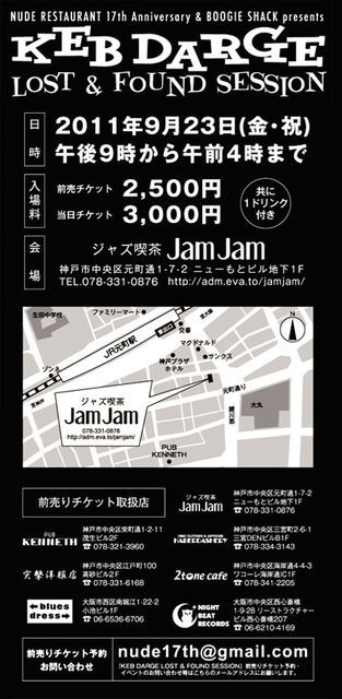 「今、一番好きな音」にこだわり、「良い音楽」を求めてきた『NUDE RESTAURANT』にとって、一番面白い、伝えたいのは50's、 60's、70'sのクロスオーバーだと感じている正に今!このタイミングでケブの新機軸『LOST&FOUND』を最高の仲間とジャムジャムで開催できるのを非常に嬉しく思います!レジデンツの三名もオリジネイターとしての誇りと17周年を迎える感慨、そして何よりも『NUDE RESTAURANT』を愛してくれる皆さんへの感謝の気持ちを胸に深く刻みお届けするホットでクールな一夜!現在進行形の最も良質なセットを是非体験、体感してください!