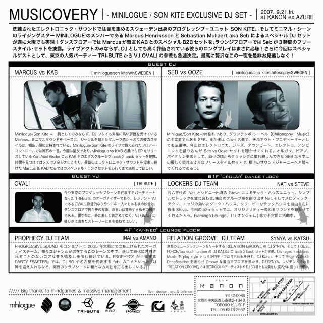 MARCUS VS KAB [Minilogue/Son Kite/WIR/Sweden] Minilogue/Son Kiteの一員としてのみならず、DJプレイも非常に高い評価を受けているMarcus。ミニマルサウンドをベースに、ジャンルを越えたグルーブ感たっぷりの彼のスタイルは、幅広い層に支持されている。Minilogue/Son Kiteのライブで鍛えられたフロアー・コントロール力は流石の一言。今回は盟友であり、Minilogue vs KAB名義でもEPをリリースしているKarl Axel-BisslerことKABとのエクスクルーシブback 2 backセットを披露。時間を見つけては2人でスタジオにこもり、最新のエレクトロニック・サウンドを探求し続けたMarcus & KABならではのスペシャル・ロングセットを心行くまで堪能してほしい。