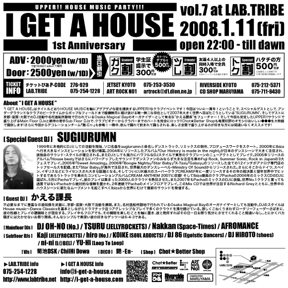 2008/1/11(FRI) open 22:00 - till dawn at LAB.TRIBE http://www.labtribe.net/ ADV:2000yen(with/1drink) Door:2500yen(with/1drink) ▼Doorのみ以下の割引があります。 [ガク割] 学生証提示で300円引き [ツレ割] 友達4以上同時入場で300円引き ※先に入っている友達は対象外 <!>ガク・ツレ併用で500円引き! [トク割] ハタチの方500円引き! ※他割引との併用不可 ※身分証明証提出時に確認します