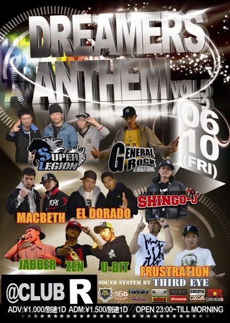第5回目となるDREAMERS ANTHEMは播州を中心に活動する4SOUND、3DEE JAYをゲストに迎えての開催。 MAC NIGHT SQUADからはMAC BETH & SHINGO-J。 若手ながら自身名義のMIX CD『MAC NIGHT MIX VOL1』をリリースし絶好調なMAC BETH。 そして同じくMAC NIGHT SQUADよりLONG TIMEなキャリアに裏打ちされたSKILLと偶数月の第3土曜日に神戸STORKでPARTY WE GO HARDを主催するSHINGO-J。 また毎月第2、第4月曜の22:00からMAC BETH & SHINGO-JでUSTREAM番組『UP MPNDAY RADIO』も好評放送中。
