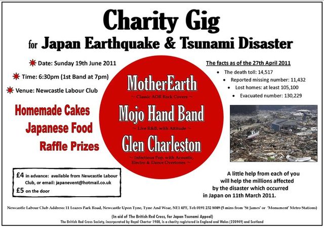 きたる6月19日(日)、東日本大震災からの日本の復興を願い、ニューカッスルにてチャリティーギグを開催しますので、お知らせします。3つのローカルバンドのパフォーマンスに加え、ホームメードケーキ・日本食の販売、並びにラッフルを予定しています。収益金は全て英国赤十字社(British Red Cross)のJapan Tsunami Appealに寄付致します。
