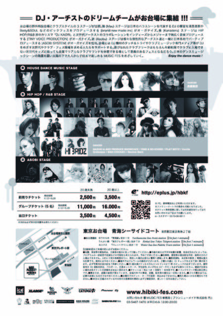 「DJ・アーチストのドリームチームがお台場に集結!!!」 お台場の野外特設会場にクラブスタイルの3ステージが出現。舞(Mau)ステージは日本のハウスシーンを代表するDJの共演を渚音楽祭やBody&SOULなどビッグフェスをプロデュースする[brand new made inc]がオーガナイズ。奏(Kanaderu)ステージはHIP HOP/R&B界のカリスマ「DJ KAORI」と次世代アーチストのコラボレーションをインディーズからメジャーまでの幅広く音楽プロデュースする[TINY VOICE PRODUCTION]がオーガナイズ。遊(Asobu)ステージは様々な個性的なアーチスト達と一緒に日本各地でパーティプロデュースする[ASOBI SYSTEM]がオーガナイズを担当。会場にはDJ機材のタッチ&トライやクラブミュージック専門メディア等がDJを目指す次世代やクラブ・フェス情報を求める人たちをサポートする。遊びなれたクラブフリークはもちろん年齢制限でクラブに入場できない次世代キッズに取っても良質でリアルなクラブサウンドを体感できる場として意義のあるフェスとなるだろう。日本のダンスミュージックシーンの発展を願い太陽の下で大人から子供まで楽しめるMUSIC FESをめざしていく。Enjoy the dance music!