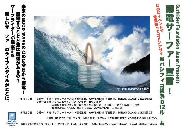 「節電サーファー宣言予約申込」というタイトルにて、氏名と連絡先を明記の上、 sfj@surfrider.jp までご連絡ください。