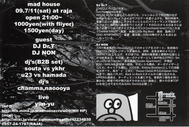 ■DJ NON 2001年 本格的にHouseDJとしてのキャリアをスタート。佐世保の『Bar COLOR』のレジデントを務める。同年、自身主宰のイベント『IMPACT』を立ち上げ、その頃では、異例の集客数と、爆発的な盛り上がりを見せる。その後、オーガナイザーとして田中知之(FPM)・Small circle of Friends・森田昌則(Studio Apartment)・中塚武・BOO・MAKAIを佐世保へ招致。サポートも勤め、オーガナイザーとしての、キャリアも積む。 2006年、Knitrio Brothersとしての活動をスタート。 相方"S"と共に、house Classic から European houseまで 幅広くPLAY。Back to Back スタイルから繰り出される、UPPERな選曲は、オーディエンスを虜にする。 音楽的2面性を持つ事から、現場で何が飛び出すか分からない選曲と、数々の日本TOP DJを唸らせてきた巧みなMix Workは必聴!!