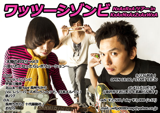LIVE ワッツーシゾンビ 99年、谷村じゅげむ(Vo,G)、安里アンリ(Vo,G)を中心に邪馬台国(奈良)で活動開始。 01年に三宅メグル(Dr)がライブ中に乱入し、そのまま加入。 02年に自主制作アルバムを全国発売し活動の場を東京及び全国に広げる。 勢力的な活動を行い05 年キャプテントリップレコードから1st album『ブッダ マスク エクスペリエンス』リリース。 あふりらんぽ、オシリペンペンズなどとともに” 関西ゼロ世代” などと評され同年FUJI ROCK FESTIVAL'05のROOKIE A GO GO ステージに出演。初のアメリカツアーも行う。翌年にはふたたびアメリカツアー敢行。 08年2nd album『ブッダ マスク レボリューション』をキャプテントリップレコードからリリース。 秋にはフリーチベットチャリティーイベントを主催。 09年5月に曽我部恵一氏主宰のROSE RECORDS よりmini album『ZOMBIE FROM EARTH』をリリース。 同年9月には同じくROSE RECORDS よりalbum『WE ARE THE WORLD!!!』をリリース。 10年9月ドラムの三宅メグル脱退するも、即座にサポートドラム山本レボリューションを迎えあいかわらずやりまくり。 11年7月 ROSE RECORDS より新生ワッツーシゾンビのニューアルバム『NxAxRxA』をリリース。 http://www.watusizombie.com/