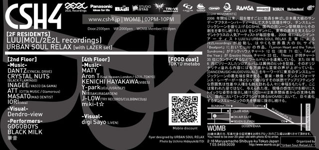2006年開始以来、回を増すごとに動員を伸ばし日本最大級のサンデーアフタヌーンパーティーとして大きな話題を呼び、クラブシーンを盛り上げるCSH4。 国内の同シーン黎明期からその創生を牽引し続ける LUUをレジデントに、東京の週末を支えるレジデントクラスの人気アーティストが毎回登場。2008年にはレジデントアーティスト LUU,VJ URBAN SOUL RELAX主宰による2E2Lrecordingsが始動し、はやくも世界最大のDLサイト「Beatport」において LUUの作品、「Lemon Heart and the Tokyo Syndrome」がテックハウスチャート12位(総合71位)、「Air of the Year」がErectro Houseチャート33位、「News」が同チャート35位にランクインするなどワールドヒットを連発している。また08年6月にリリースしたソロアルバムは異例のヒットを記録、そのオリジナリティ溢れる内容には各方面から賞賛の声が上がっている。[DANCEMUSIC+AUDIOVISUAL]をキーワードに東京のクラブシーンの最先端を突き走る。音楽・映像・ダンスパフォーマンス・レーザーが一体となって織りなすその妖艶でアップリフティングな雰囲気は性差や人種をも越え訪れる人々に幸福をもたらす。 ここは奪われた昼ではなく、与えられた夜。現場の感性だけを頼りにストイックな姿勢を提示し続けたCSH4は業界関係者からの支持も熱い。国内においてトップブランドを誇るWOMBにおいて、日々進化するクラブミュージックの先を明確に提示し続ける。