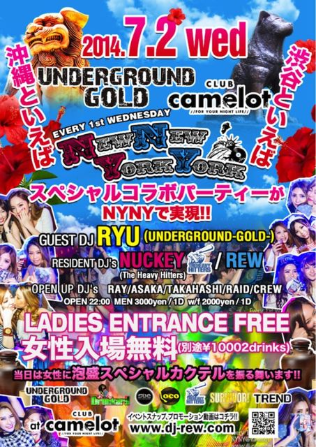 7.2(水)NEW YORK NEW YORK@渋谷camelot(毎月第1水曜日) "DJ ONLY NON STOP PARTY"女性は終日入場無料のこのパーティー!! クラバーなら1度は行った事があるのでは!?沖縄のクラブで不動の位置を有する『アングラ』こと"UNDERFROUND -GOLD-"と渋谷camelotとのコラボがNYNYで実現!!