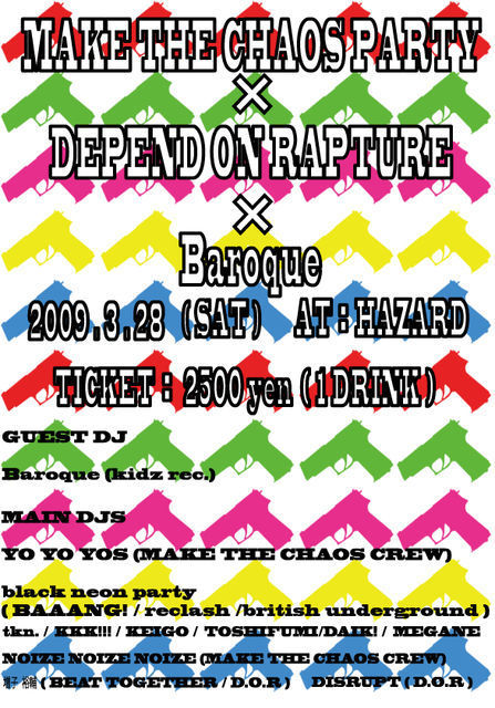numark-iDJ2を自在に操り、4つ打ちを基盤にelectro,new rave,rockでフロアをロックし続ける新進気鋭のU HEY!とyuukii!310!からなるDJユニットblack neon party! Late Of The Pierとツアーを回ったことでも有名なmaths class、 「Disco Dancer」7インチでイギリスインディーチャート3位までのぼり一躍有名になったPARKA、 スリリングな展開と凶暴なポップ制を持ったシングルでインディ/UKファンの間で話題騒然となったYELPS など海外のアーティストとも競演し、確実に名を轟かせている。