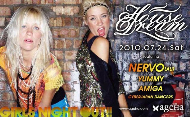 キーワードは、ゴージャス&グラマラス!7月の "HOUSE DREAM"のスペシャルゲストは、大注目の美人双子DJユニット、NERVO!アリーナは、『Girls Night Out』と題し、YUMMY、AMIGAと実力派女性DJが集合する華やかなスペシャルバージョンをお届けします。WATERは、夏気分を盛り上げる"BIKINI NIGHT"がジャック。夏先取りの大注目パーティー。盛り上がり必須です!