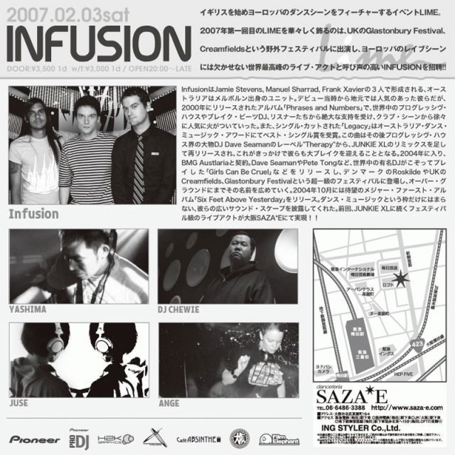 Infusion: InfusionはJamie Stevens, Manuel Sharrad, Frank Xavierの3人で形成される、オーストラリアはメルボルン出身のユニット。デビュー当時から地元では人気のあった彼らだが、2000年にリリースさ れたアルバム「Phrases and Numbers」で、世界中のプログレッシヴ・ハウスやブレイク・ビーツDJ、リスナーたちから絶大な支持を受け、クラブ・シーンから徐々に人気に火が ついていった。また、シングル・カットされた「Legacy」はオーストラリア・ダンス・ミュージック・アワードにてベスト・シングル賞を受賞。この曲 はその後プログレッシヴ・ハウス界の大物DJ Dave Seamanのレーベル"Therapy"から、JUNKIE XLのリミックスを足して再リリースされ、これがきっかけで彼らも大ブレイクを迎えることとなる。2004年に入り、BMG Austlariaと契約。Dave SeamanやPete Tongなど、世界中の有名DJがこぞってプレイした「Girls Can Be Cruel」などをリリースし、デンマークのRoskilde やUKのCreamfields、Glastonbury Festivalという超一級のフェスティバルに登場し、オーバー・グラウンドにまでその名前を広めていく。2004年10月には待望のメジャー・ファ ースト・アルバム「Six Feet Above Yesterday」をリリース。ダンス・ミュージックという枠だけにはまらない、彼らの広いサウンド・スケープを披露してくれた。前回、JUNKIE XLに続くフェスティバル級のライブアクトが大阪SAZA*Eにて実現!!
