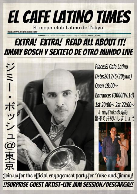 ★Jimmy Bosch y su sexteto de otro mundo Live- Jimmy&Yuko ,Engagement Party!!- @ Roppongi El Cafe Latino☆ Dj:Alec ...あのJimmy BoschがLiveを行います... 5月20日(日曜日)5/20(SUN) OPEN19:00 1st20:00〜 2st22:00〜 !!!Surprise guest artist-LIVE Jam Session/Descarga!!! ¥3000 W1 Drink チケット販売中です。ご来場の方はチケットをお早めにご購入 下さい. Join us for the official engagement party for Yuko and Jimmy!! ジミーボッシュライブ、