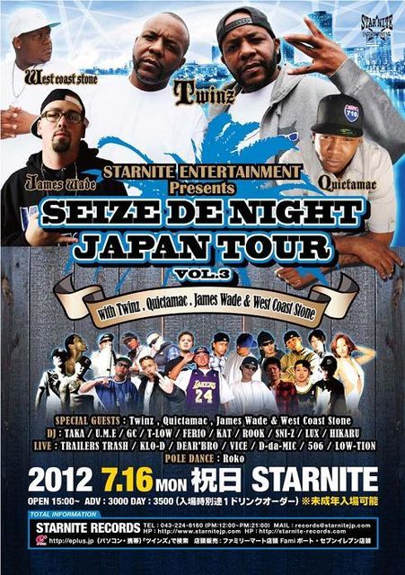Snoop Doggをはじめとするビッグ・アーティストが名を連ねるウエスト・コースト最重要都市ロングビーチ。古くから活動を続ける2組のレジェンドが2012年多くのクラシック・ナンバーを引き下げ来日。Warren Gのデビュー・アルバム「Regulate...G Funk Era」に参加しキャリアをスタートさせ、歴史的クラシックとなったデビュー・アルバム「Conversation」で世界中のファンを魅了し、双子である事も有名なTwinz。Snoop Doggをはじめとするビッグ・アーティストと共に活動を続け、多くの作品をリリースするQuictamac。ロングビーチを代表する二組が本物の風を吹かしに堂々来日!!更にSnoop Doggをはじめとしたビック・アーティストと多方面のプロジェクトでリンクをするJames Wade、シアトルからラッパー / プロデュース / トークボックスもこなす日本でも根強いファンを獲得するWest Coast Stoneも同時来日!!