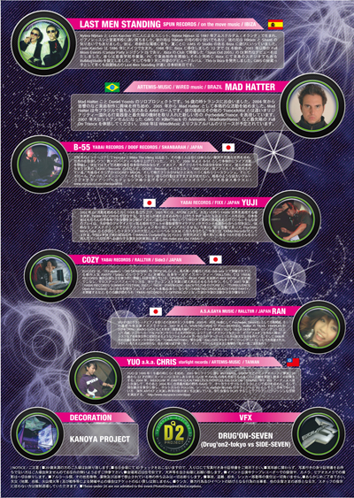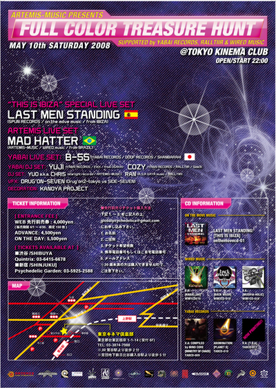 そして2007年夏、「YABAI RECORDS SUMMER FESTIVAL 2007」・「NEW DIMENSION BACK TO THE FUTURE 3」・「TURBULENCE Open Air Festival」などの大型野外フェスティバルへ多数出演し、自らも「YABAI RECORDS BEACH FREE PARTY」を開催するなど、その功績が認められ「YABAI RECORDS」のOFFICIAL DJとなった彼の今後の活動から目が離せない!