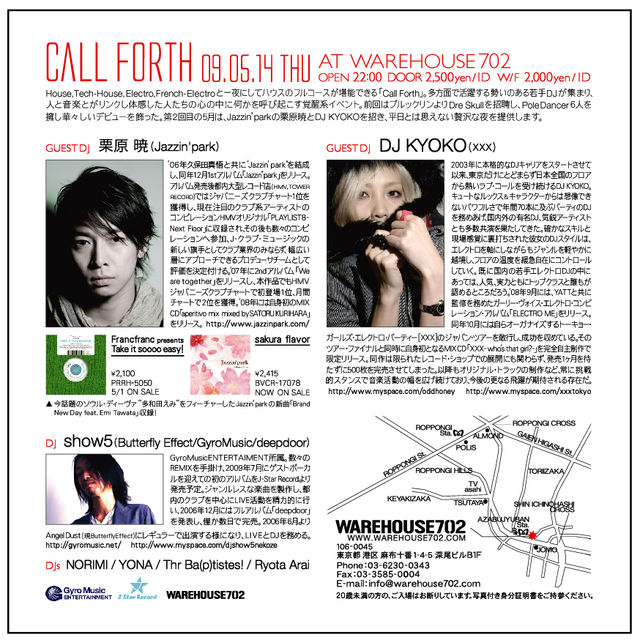 DJ KYOKO(XXX) 2003年に本格的なDJキャリアをスタートさせて以来、東京だけにとどまらず日本全国のフロアから熱いラブ・コールを受け続けるDJ KYOKO。キュートなルックス&キャラクターからは想像できないパワフルさで年間90本に及ぶパーティのDJを務めあげ、国内外の有名DJ、気鋭アーティストとも多数共演を果たしてきた。確かなスキルと現場感覚に裏打ちされた彼女のDJスタイルは、エレクトロを軸にしながらもジャンルを軽やかに越境し、フロアの温度を緩急自在にコントロールしていく。既に国内の若手エレクトロDJの中にあっては、人気、実力ともにトップクラスと誰もが認めるところだろう。 '08年9月には、YATTと共に監修を務めたガーリー・ヴォイス・エレクトロ・コンピレーション・アルバム『ELECTRO ME』をリリース。同年10月には自らオーガナイズするトーキョー・ガールズ・エレクトロ・パーティー [XXX]のジャパン・ツアーを敢行し、成功を収めている。そのツアー・ファイナルと同時に自身初となるMIX CD 『XXX - who's that girl? -』を完全自主制作で限定リリース。同作は限られたレコード・ショップでの展開にも関わらず、発売1ヶ月を待たずに500枚を完売させてしまった。以降もオリジナル・トラックの制作など、常に挑戦的スタンスで音楽活動の幅を広げ続けており、今後の更なる飛躍が期待される存在だ。