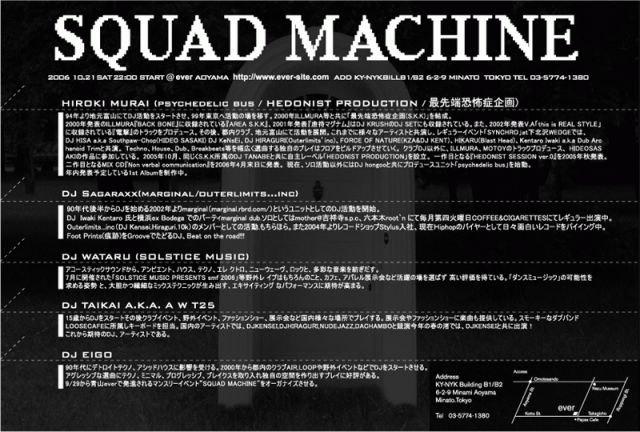"SQUAD MACHINE" 2006 10.21 sat 22:00 START @ ever AOYAMA http://www.ever-site.com ADD KY-NYKBILLB1/B2 6-2-9 MINATO-KU TOKYO TEL 03-5774-1380 W/F2500 DOOR3000 LADY'S ENTRANCE FREE ”SQUAD MACHINEでは、ジャンルレスなダンスミュージックを提案、追求して行く!アーティストが持つ個性あふれるプレイを演出しアンダーグラウンドでDEEPな空間をプロデュース。音楽、ファッション、アート、ビジネス、様々な情報交換にもして行きミスマッチと思われるコラボレートで新しい物も提案して行く。 GUEST DJ HIROKI MURAI (psychedelic bus / HEDONIST PRODUCTION / 最先端恐怖症企画) DJ Sagaraxx(marginal/outerlimits...inc)