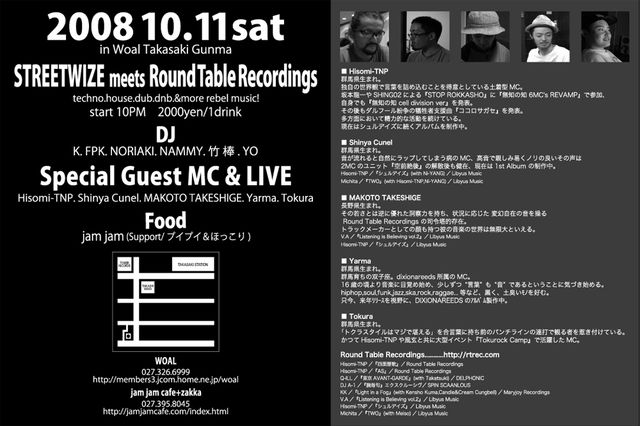 Dj// K. FPK. NORIAKI. NAMMY. 竹 棒. YO Special Guest MC & Live// Hisomi-TNP. Shinya Cunel. MAKOTO TAKESHIGE. Yarma. Tokura Food// jam jam (Support/ プイプイ&ほっこり)