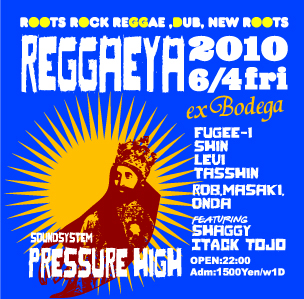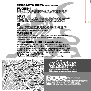 Soundsystem Pressure High Soundsystem Rob (Eng)、Masaki (S)、Onda (S)による、UKスタイルルーツレゲエサウンドシステム。ルーツレゲエとダブに特化して設計され、さらにリニューアルを繰り返すそのシステムは、驚異の重低音ベースラインを奏でる。繊細さと豪快さを併せ持つ、セレクターとしての彼等のプレイ、さらに再開したトラックメイカーとしての活動も要注目。 http://www.myspace.com/pressurehigh