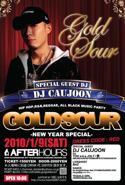 2010年1発目、奇数月第2土曜日のHIPHOP PARTY「GOLDSOUR」!今回のSPECIAL GUESTは名古屋が誇るPARTY MASTER!「DJ CAUJOON」!通産100枚目のMIXをリリースしたばかりのDJ CAUJOONが金沢AFTERHOURSを揺らしまくる!!