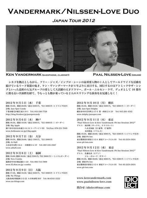 2012年9月7日(金) 大分 開場19:30、開演20:00/前売1500円、当日2000円 会場: At Hall 大分市中央町2-6-4 一井開発ビル3F Tel: 097-535-2567 http://www.athall.com