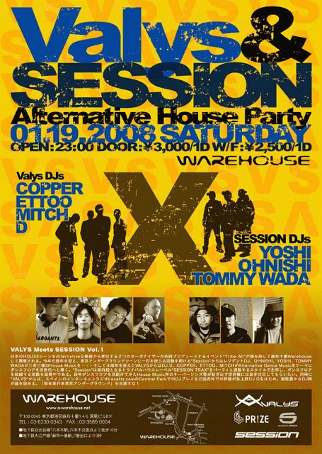 VALYS Meets SESSION Vol.1 Dear clubbers! For the first Valys party in 2008 we are more than please to provide you a special event which is the first official collaboration between your Alternative House organizer Valys in Warehouse and with the Session crew from the famous Tribal House parties in WOMB. To do not miss as always!