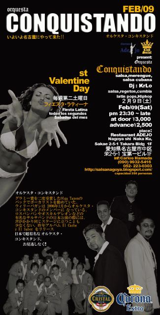 Hola amigos los invitamos a la Fiesta Latina de Febrero en Nagoya (Febero 9 Sab) Nagoya Club Social presenta: ORQUESTA CONQUISTANDO Fiesta latina (segundo sábado de cada mes) Evento que se realiza una vez al mes presentando Orquestas , foráneas ylocales fecha:Sabado 9 de Febrero Orquesta: CONQUISTANDO Dj: KRLo precio: ¥2,500(anticipado) /¥3,000 (el mismo dia) Lugar: Rest Adejo direccion:Nagoya shi Naka Ku sakae 2-5-1 Takaradaichi bldg 1F Estación de Sakae o Fushimi(espalda del iD bar) Capacidad 350 personas inf:Carlos Hamada 090-9932-5416 / Rest Adejo 052-223-0303 o visite nuestro bloghttp://salsanagoya.blogspot.com