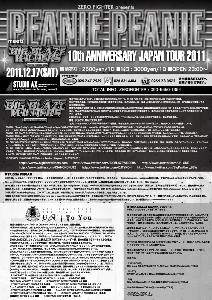 今回のPEANIE PEANIEはBIG BLAZE WILDERS 10th ANNIVERSARY JAPAN TOUR 2011題し、SPECIAL GUESTに東京からBIG BLAZE WILDERS、埼玉からTRIGGA FINGA!!そして新潟HIP HOPグループNITE FULL MAKERSからUSU aka SQUEZ、TORA aka DJ TAZAWAによるスペシャルナイトです。