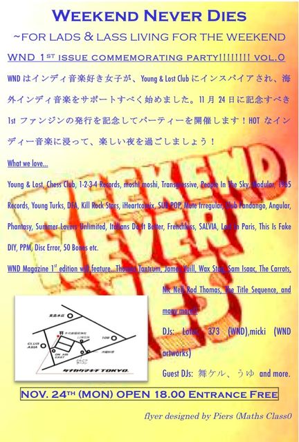 Weekend Never Diesは、インディー音楽好き女子二人が敬愛するレーベルYoung&Lost Clubにインスパイアされ、海外インディーミュージックをサポートするために始めたものです。東京でもまだイベントであまりかかることの少ないインディーミュージックまで大好きな音楽をインディー好きの人たちと一緒に楽しめたらいいと思います。そんな私たちのファンジン第一号創刊を記念してParty vol.0を11月24日に行います!