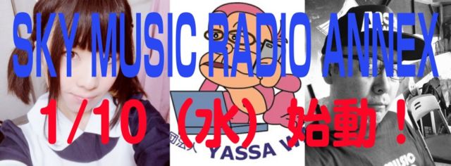こんにちは。 いつもご視聴くださりありがとうございます。 2012年4月からお楽しみいただいております「SKY MUSIC RADIO」ですが 今回より放送スタジオを「オーシャンリゾート千葉県東金市」の 『インターネットステーション「YASSA WAVE 千葉東金」』に移し、 番組名の『SKY MUSIC RADIO ANNEX』に変更、内容もパワーアップしてお届けします。 放送時間も「1時間」となり、より多くの情報をお届けできると思いますので どうぞご期待ください!
