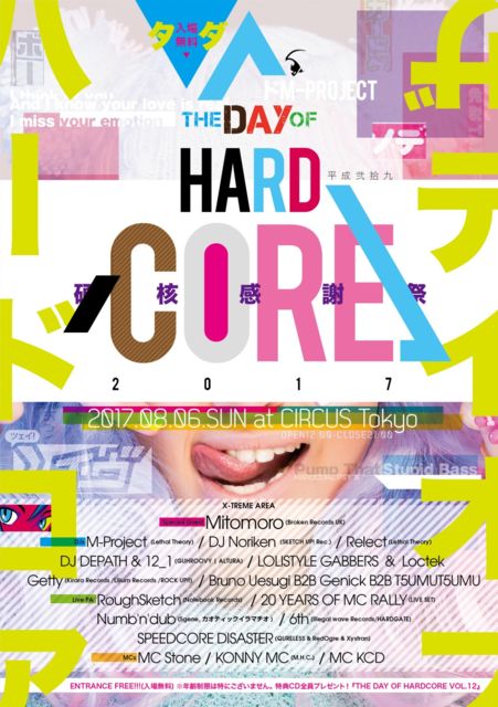 2017/08/06(日) THE DAY OF HARDCORE 2017 硬核感謝祭 @ CIRCUS Tokyo http://circus-tokyo.jp/ OPEN/CLOSE : 12:00-21:00 ENTRANCE FREE!!!(入場無料) ※年齢制限は特にございません。