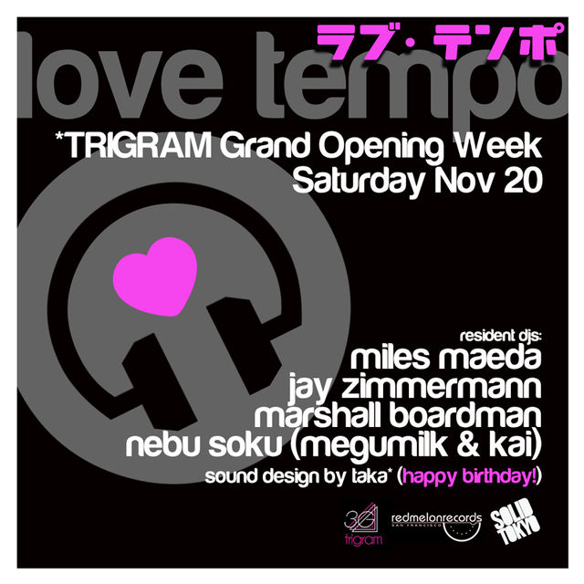 南青山に新しくオープンするtrigramにて、毎月第三土曜に開催されるハウスミュージックパーティー LOVE TEMPO。 このパーティーのレギュラーDJとしてMiles Maedaが出演しますので、是非遊びにいらして下さい。