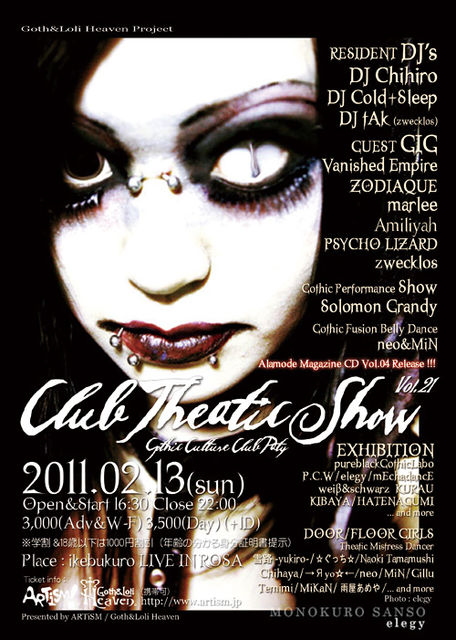 ARTiSMが贈る国内最大級のGoth Club Event「Club Theatic Show」。Darkな「音」と「様式美」を融合させGothicを基盤にEBM/Industrial/DarkElectro/NewWave/PsitivePunk/DeathRock等をフロアに重く響かせる。暗黒の大迷宮にて踊り狂う冥界の住人達と共に一夜をお過ごし下さいませ。