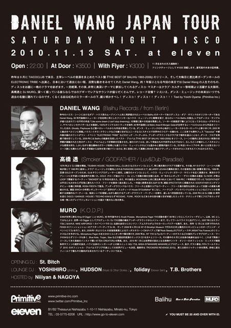 昨年は6月にTAICOCLUBで来日、主宰レーベルの音源をまとめたベスト盤『THE BEST OF BALIHU 1993-2008』のリリース、そして大晦日に恵比寿ガーデンホールのELECTRONIC TRIBEへ出演と、日本において過去にない程、活発な動きをみせてくれたDaniel Wang。約1年振りとなる今回の来日ではDanielWangの人生そのもの、ディスコをお題に一晩のドラマを紡ぎます。一見軽薄、その実、非常に奥深いテーマに参加してくれるディスコ・マスターはクラブ・カルチャー黎明期より活躍する大御所、高橋透とDJ MURO。深〜く掘っている彼らならではのブギーでレアなサウンドが盛りだくさんです。レコード自慢?いえいえ、ダンス・ミュージックの未来はいつでも過去の名盤に隠れているのです。くるくる回る虹色のミラーボールの下、踊り明かすべし! ディスコ!ディスコ!!ディスコ!!!