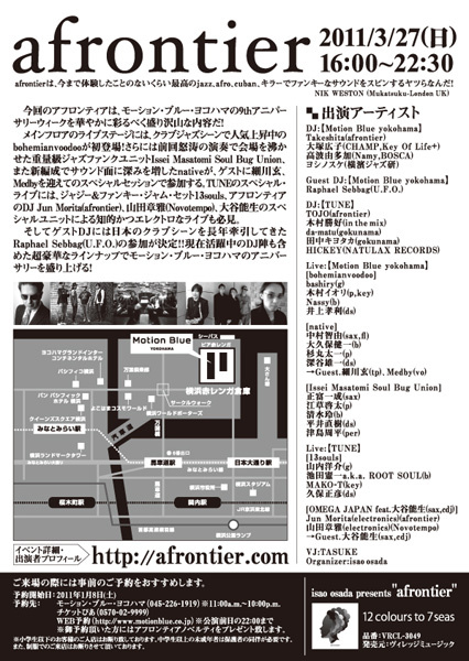 Bar TUNEのスペシャル・ライブには、ジャジー&ファンキー・ジャム・セット13souls、アフロンティアのDJ Jun Morita(afrontier)、山田章雅(Novotempo)、大谷能生のスペシャルユニットによる知的かつエレクトロなライブも必見。そしてゲストDJには日本のクラブシーンを長年牽引してきたRaphael Sebbag(U.F.O.)の参加が決定!!現在活躍中のDJ陣も含めた超豪華なラインナップでモーション・ブルー・ヨコハマのアニバーサリーを盛り上げる!