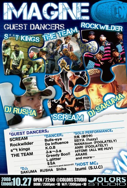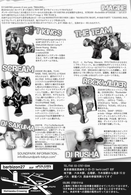 最近かからなくなってしまった曲からNEW HITまでをジャンルレスでかけるなどダンサーだけではなく耳の肥えたリスナーからの支持も強いDJ SAKUMAが音源製作も務める、SCREAM・Rockwilderが今回出演!!また若手ながら都内を中心に人気急上昇中のs**t kingzとTHE TEAMも出演するなど平日ながら豪華な顔ぶれだ!!
