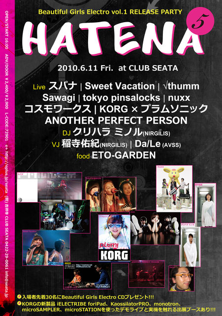 2010/6/11(fri) @ 吉祥寺CLUB SEATA http://seata.jp/artist.html 『HATENA 5 ?Butiful Girls Electro vol.1 RELEASE PARTY?』 United TechnoLiveParty hosted by spanner and CLUB SEATA. ADV/DOOR ¥2,400-(+1D)/¥2,900-(+1D) OPEN/START 16:00