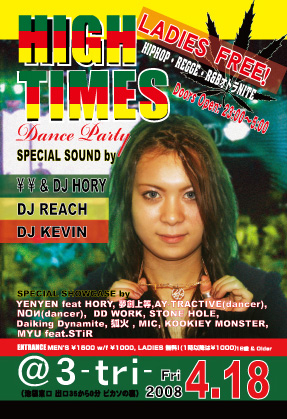 HIGH TIMES ダンスパーティー vol.5 -HIPHOP,REGGEA,R&Bオドラnite- レディースフリー! 4月18日(金)2008年。 @ 3 -tri- 池袋東口 出口35から0分 ピカソの裏