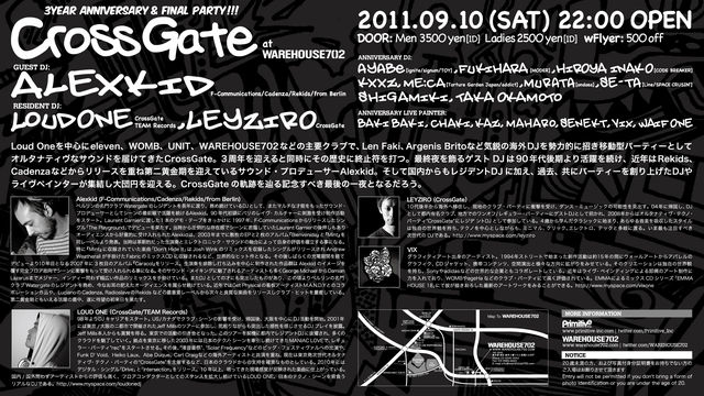 Loud Oneを中心にeleven、WOMB、UNIT、WAREHOUSE702などの主要クラブで、Len Faki、Argenis Britoなど気鋭の海外DJを勢力的に招き移動型パーティーとしてオルタナティヴなサウンドを届けてきたCrossGate。3周年を迎えると同時にその歴史に終止符を打つ。最終夜を飾るゲストDJは90年代後期より活躍を続け、近年はRekids、Cadenzaなどからリリースを重ね第二黄金期を迎えているサウンド・プロデューサーAlexkid。そして国内からもレジデントDJに加え、過去、共にパーティーを創り上げたDJやライヴペインターが集結し大団円を迎える。CrossGateの軌跡を辿る記念すべき最後の一夜となるだろう。