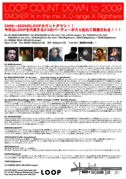 DJ DJ NORI(SMOKER) DJ MOCHIZUKI (in the mix / MOL) DJ LUU(2E2L Recordings / MOL / CSH4 / O-range / LIVEN / ElecTek Phunk) DJ YOSHIO(UGP / in the mix) KIMURA(in the mix) TOKUKAZU(in the mix) IKE(Righthere) KAZZ(Righthere) TAKE(Righthere)