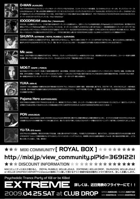 MIXIコミュニティにお入り頂けると、『ROYAL RUMBLE』@CLUB JOULE、『EXTREME』@CLUB DROP、『SURVIVOR』@CLUB JOULE or @CLUB DROPの3つのPARTYにDiscount価格にて入場して頂けるゲスト登録を毎回自動的にさせて頂きます。宜しくお願いします。