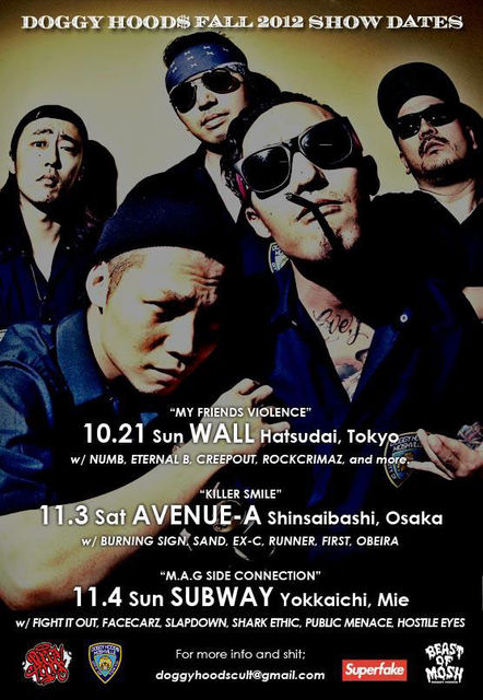 今回は、東京からH8MONGER氏率いるDOGGY HOOD$が四日市初登場!そして、今かなりの勢いでライブを敢行しているFIGHT IT OUTも久々にやってきてくれます!名古屋からもBLOODAXE FESTでその存在感を知らしめたSHARK ETHICと、最近勢いのある活動が目立つPUBLIC MENACEが出演!三重勢もこないだのM.A.G SIDE x ROCKOUTで怒濤のライブを披露したFACECARZと、SLAPDOWNも参戦!そして、三重県若手ビートダウンスラミンデスバンドHOSTILE EYESも初出演、若干19才のメンバーからなるこのバンドかなり期待大!凄い音してます!w DJ陣も久しぶりに豊橋からDJ ZAKU、SLAPDOWNからDJ YAGA3とかなり濃〜い夜となるので、みなさん是非遊びに来て下さい!!!