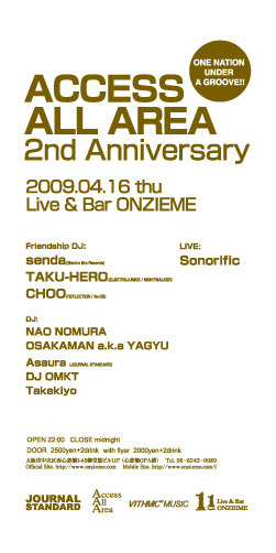 2007年4月梅田danceteria SazaeにてスタートしたACCESS ALL AREA。 活動拠点を心斎橋Live&Bar 11(ONZIEM)に移し、Pete Heller・James Murphy等との共演も記憶に新しい。 One Nation Under Grooveの精神の基、HOUSE MUSICを軸に、世界中の全てにアクセスする。2周年を迎える4月には関西(京都/大阪/神戸)を拠点として精力的に活動中のsenda/TAKU-HERO/CHOOを招いて開催する。どうぞご期待ください!!