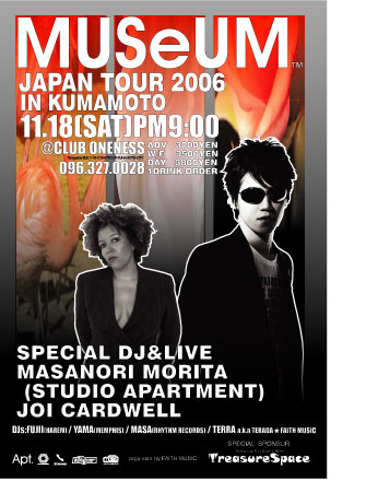 250名限定::::規定枚数に達しましたら販売終了です。 東京、熊本の2箇所だけのスペシャルプログラム! 即完売が予測されますので早めのご決断を!!! -------------------------------------------------- TreasureSpace PRESENT MUSeUM JAPAN TOUR 2006 IN KUMAMOTO 2006.11.18(SAT)PM9:00~ @CLUB ONENESS 096-327-0028 ADV 3000YEN W/F 3500YEN DAY 3800YEN 1DRINK ORDER